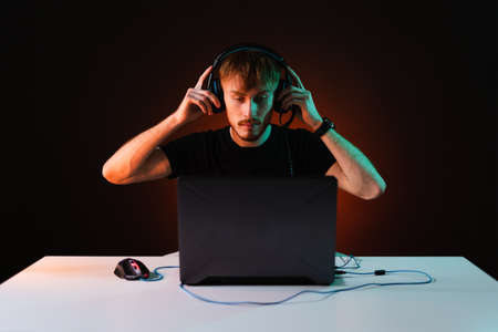 Portrait of Software Developer. Hacker. Gamer Wearing Headset Sitting at His Desk and Working. Playing on Laptop. In the Background Dark High Tech Environment with red neon lights.