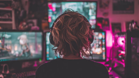 A person is captured from behind, wearing headphones and looking at a series of computer monitors. The scene is illuminated by the light from the screens, giving the image a modern and tech-focused feel. The composition suggests a setting of entertainment or information consumption. Suitable for commercial or editorial applications.