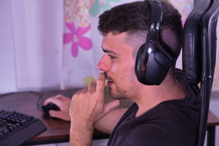 Man in headphones playing with a gamepad a computer game on desktop PC. Concept of game addiction, home leisure