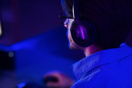 Back view shot of professional gamer playing online video game on his gameset. Room lit in neon light and retro style. Using headphones to talk with the team. Entertainment, fun concept.
