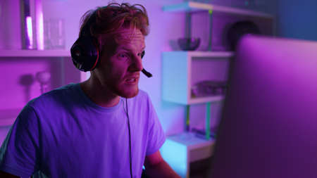 Cyber gamer talking team in headphones closeup. Gaming blogger streaming video tournament commenting actions. Excited ginger man focused player enjoy online battle round. Emotional guy rest on weekend