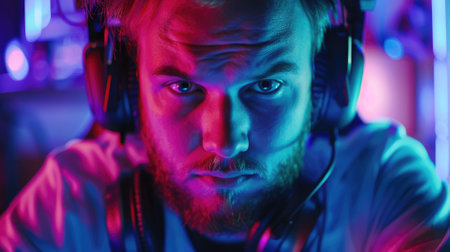 Gamer or streamer in headphones with microphone sits at home in neon light and plays at pc