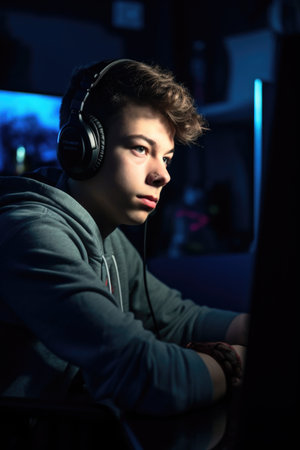 Teeenage playing computer game with headphone