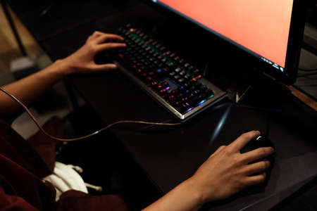 Clouseup photoshoot of gamars hands and keyboard at dark syber club.