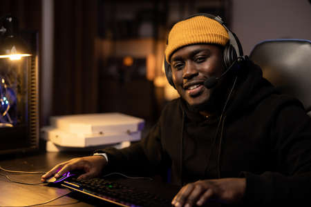 Professional gamer playing online games tournaments pc computer with headphones, Blurred red and blue background