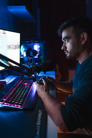 Portrait of emotional gamer in headphones playing computer games at home at table at night, yelling into microphone and looking intently at computer screen. Expressive gamer broadcasts a game stream