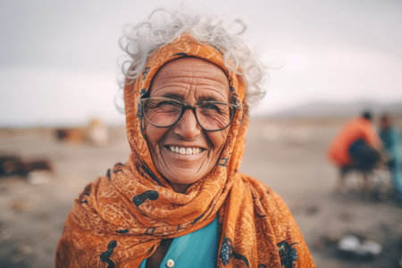 Portrait of an elderly Indian woman wearing a headscarf on the beach.