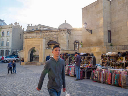 BAKU,AZERBAIJAN - APR 19, 2018: Architecture of the Historic part of Baku Icheri Shekher , Azerbaijan. Old town of Baku, is a popular destination among tourists, antique shops in the old town, fortress.