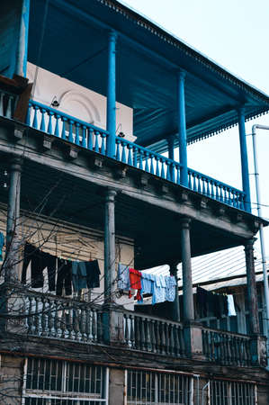 TBILISI, GEORGIA - JULY 10, 2018: Old Tbilisi architecture, windows and balcony exterior decor in Tbilisi, Georgia