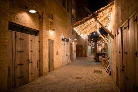 Dubai, UAE, 07 November 2021: Al Seef Meraas Dubai-old historical district with traditional Arabic architecture at night.