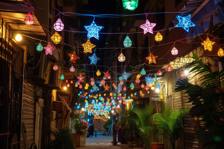 Glowing lanterns illuminating modern street view on ramadan night. concept of cultural celebration, festive atmosphere, evening traditions, street decorations.
