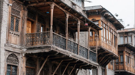 Historic wooden balconies and decorative architecture in Tbilisi, Georgia during golden hour