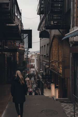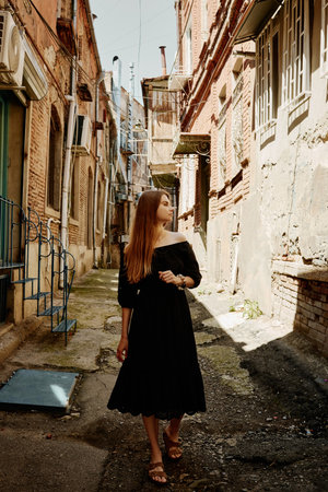 Young beautiful blonde woman in black dress walking in old street. Tbilisi, Georgia.