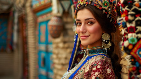 A beautiful woman in a traditional dress, smiling and posing against a cultural backdrop.