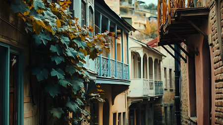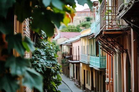 Focus lies on a scenic street featuring vibrant, pastel-colored buildings and intricate iron balconies, partially veiled by leaves, offering a glimpse of Georgia's charm.