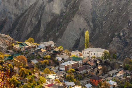 High mountain city on the rock. Authentic Dagestani mountain village of Gunib. Russia. Aerial view.