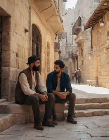 Two bearded men sitting on the stairs in the old city of Jerusalem