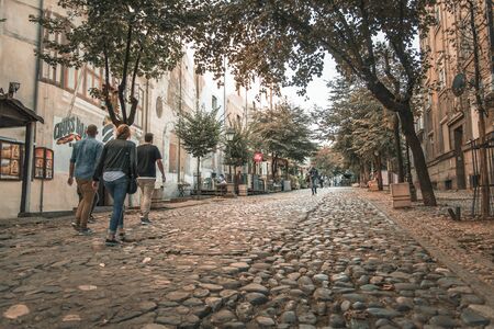 BELGRADE SERBIA, SEPTEMBER 2017: Skadarlija street, popular tourist attraction ,old Belgrade. Filled with restaurants and coffee shops. Tourists passing by, walking on the cobblestone.