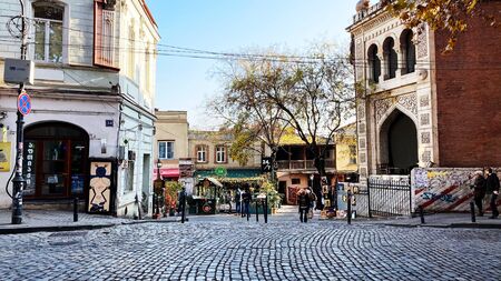TBILISI, GEORGIA DECEMBER 14, 2019: Old Tbilisi architecture, Cobbled streets in Tbilisi, Georgia.