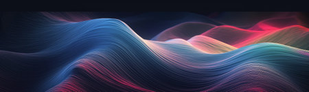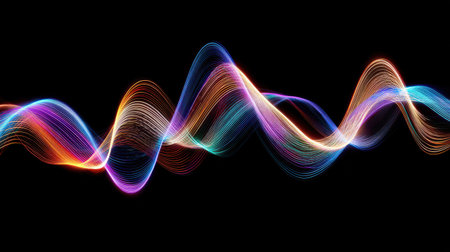 This image showcases an abstract representation of sound waves, visualized through dynamic colorful lines. The composition features layered, undulating forms with a variety of hues. The image is suitable for scientific visualizations, technological concepts, or artistic interpretations, and for commercial applications.
