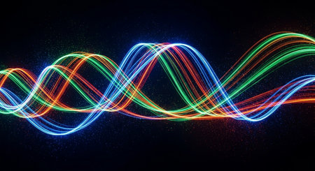A captivating visual of abstract waves of light in vibrant colors, creating a dynamic motion on a dark background. Ideal for design and creative projects.