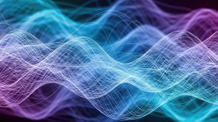 Abstract showing wavy lines of blue and teal light particles creating a dynamic and flowing abstract wave pattern....