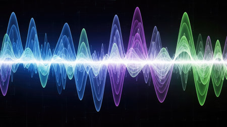 Vibrant abstract sound wave visualization featuring colorful peaks and troughs against a dark background, symbolizing sound frequency and energy. Ideal for technology, science, and multimedia themes.