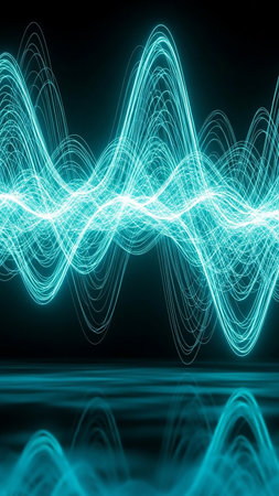 A vibrant cyan and white abstract sound wave pattern pulsates with energy against a dark background, with reflections below.