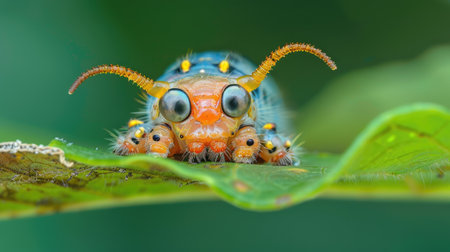 This captivating close-up image features a colorful caterpillar perched on a textured surface, showcasing its large, expressive eyes in a lush forest setting.