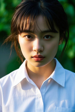 A young Asian woman with long, dark hair is captured in a close-up portrait, looking off to the side with a thoughtful expression. The soft, natural lighting highlights her features against a blurred green background, suggesting an outdoor setting.