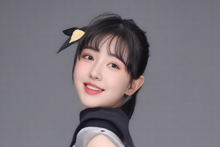 Pretty Asian individual with a warm, inviting smile, background for copy space or marketing purposes