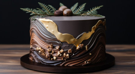 A rich chocolate cake sits elegantly on a black plate, its glossy surface topped with gold flakes and chocolate shards. The setting highlights the dessert's luxurious appeal.