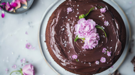 An overhead shot of a freshly baked vegan chocolate cake, the glossy frosting and edible flowers on top making it a masterpiece of plant-based baking.