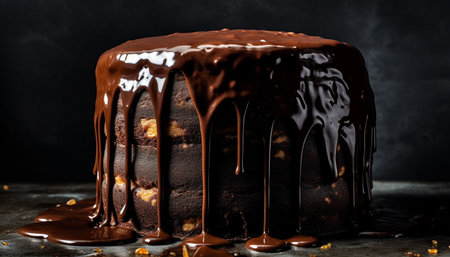 Pouring chocolate sauce onto delicious fresh cake Generative AI