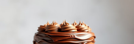 Close up of luxurious, glossy chocolate cream swirled into a peak, showcasing its rich texture and indulgent appeal against a plain background