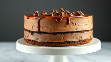 Delicious layered chocolate cake with glossy ganache topping displayed on a white cake stand