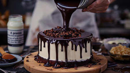 Elegant chocolate cake being generously topped with rich ganache in a cozy kitchen setting