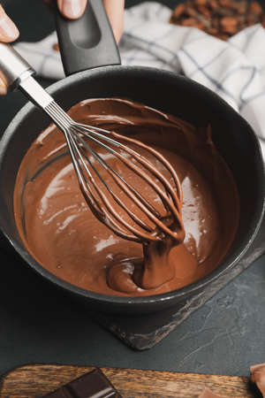 Pastry chef tempering hot dark chocolate. Cooking desserts. Soft selective focus.