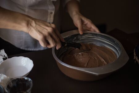 Bowl with fresh dough for preparing chocolate brownie on dark wooden background