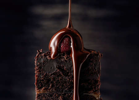 Chocolate cake topped with thick liquid chocolate topped with baked raspberry. Gourmet Dessert. French cuisine.