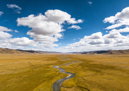 Mountain holy lake in Tibet with prayer flags- view from the highway on the way from Lhasa to Kailash, Tibet, Asia