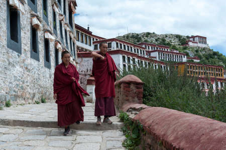 LHASA, TIBET, CHINA - AUGUST, 17 2018: Tibetan monks in the Ganden Monastery located at the top of Wangbur Mountain, Lhasa Tibet