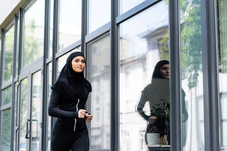 two happy muslim friend taking selfie or video calling outdoor using her smart phone during sport break outdoor