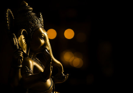 A detailed close-up of a golden Ganesha statue, set against a backdrop of soft, blurred, orange bokeh lights. Generative Ai