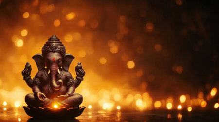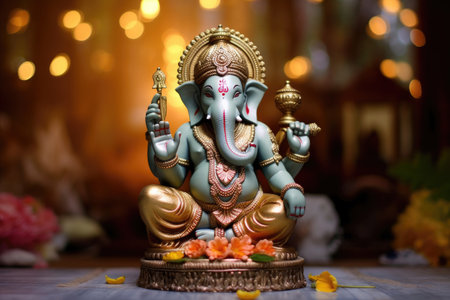 Ganesha statue on a lotus flower with a festive bokeh background. Concept of Hinduism, spirituality and Indian culture.