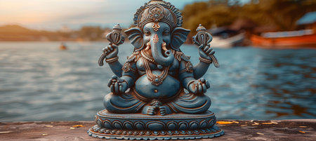 A beautifully crafted Ganesh statue sits majestically on a rocky outcrop, with gentle ocean waves lapping nearby during a serene sunset, creating a peaceful atmosphere.