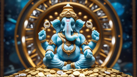 A beautifully detailed and vibrant statue of Lord Ganesha, crafted in a striking turquoise hue with intricate golden adornments and jewelry. The figure is seated gracefully on a pile of gold coins, symbolizing prosperity and abundance, with a rich, ornate circular background glowing with blue and gold elements. Perfect for spiritual, cultural, and decorative themes.