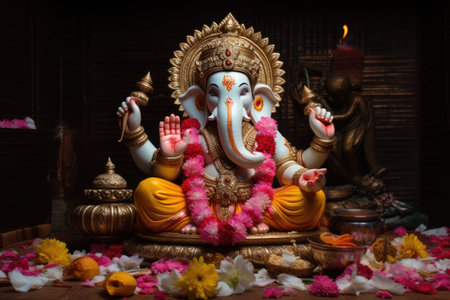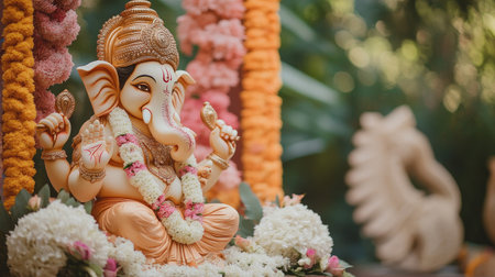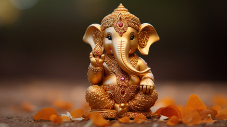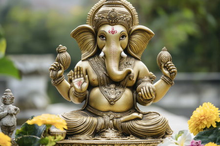 A beautifully crafted golden statue of Lord Ganesha, surrounded by colorful flowers, captures the essence of Hindu spirituality and devotion.