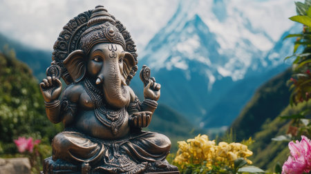 Ganesha statue with a backdrop of a majestic mountain range