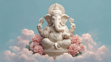 A stunning white Ganesha sculpture rests peacefully among soft pink clouds and delicate florals, conveying a sense of spirituality and serene beauty. Perfect for art lovers.